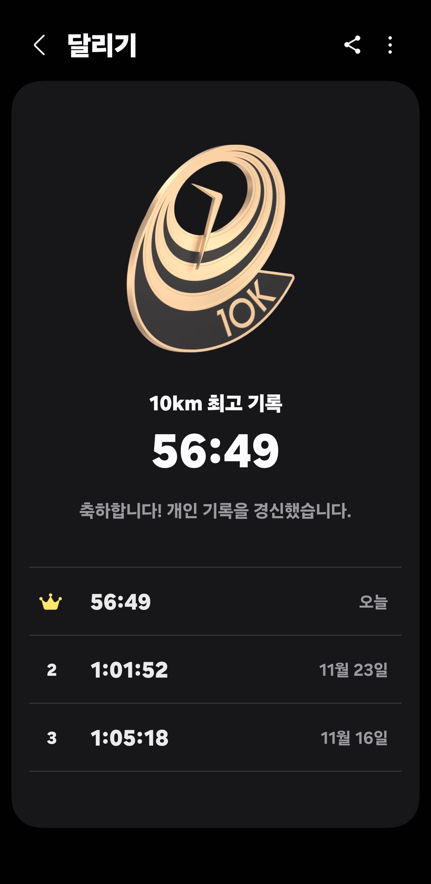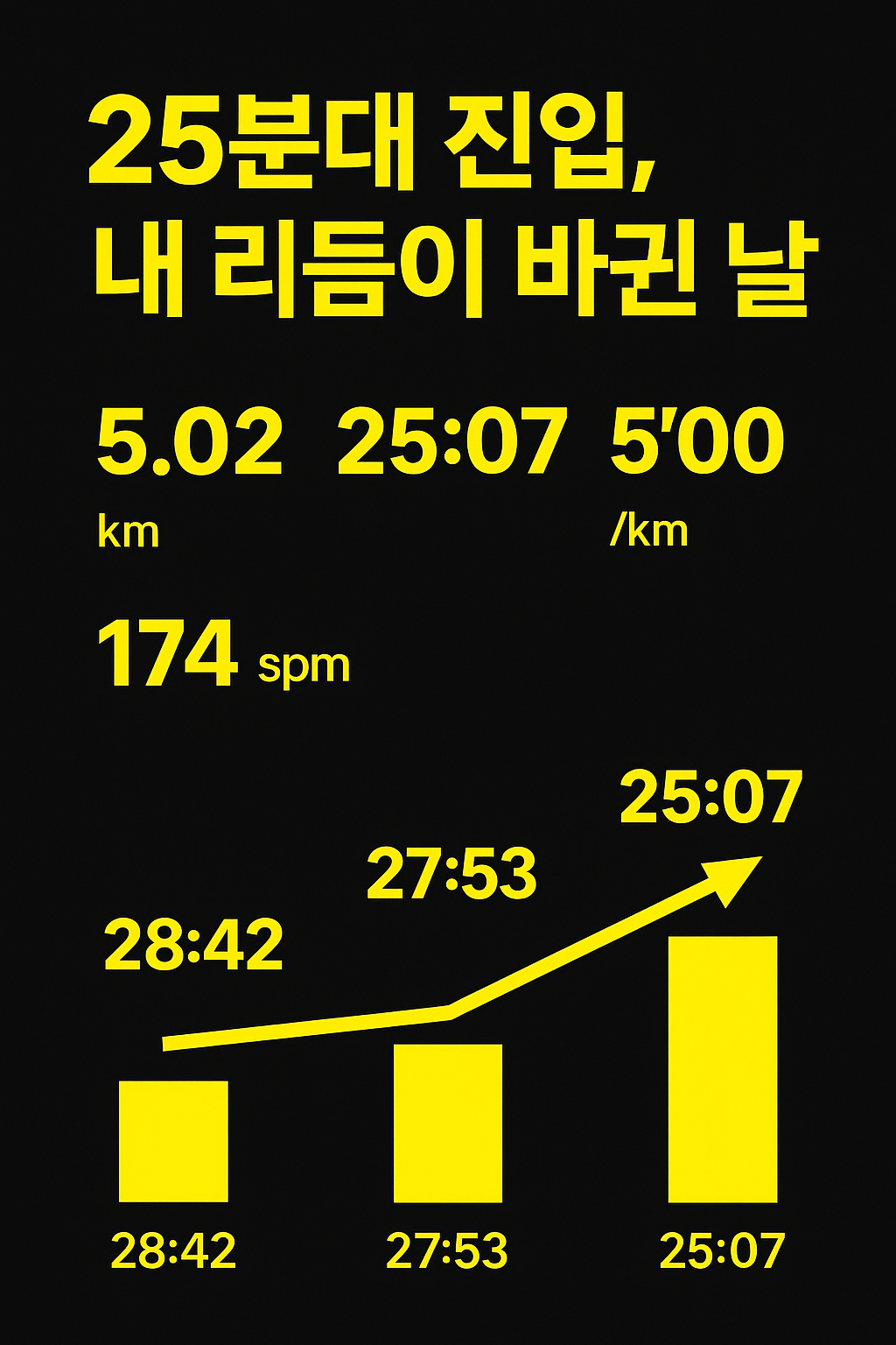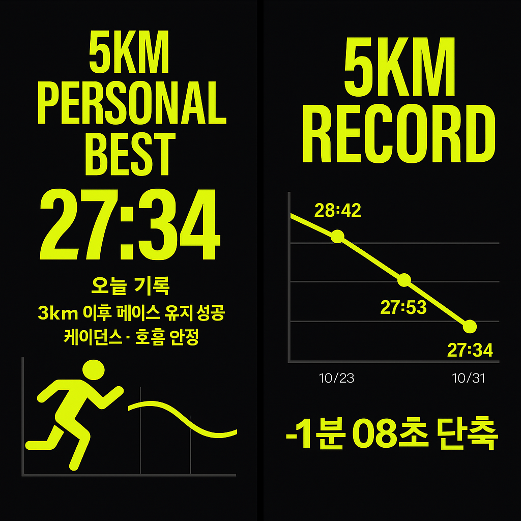 10km / 56:49.러닝을 시작했을 때는 상상조차 못 했던 숫자였다.그동안의 누적 루틴이 완전히 몸에 스며들며,드디어 ‘1시간 벽’을 돌파한 순간이다.📊 오늘의 기록 요약항목수치거리10 km시간56분 49초평균 페이스약 5’41/km칼로리약 720 kcal이전 기록1:01:52 (–5분 03초 단축)⚡ 1시간 벽을 깨다10km 러너에게 **“1시간 이내 완주”**는체력, 리듬, 집중력 모두를 증명하는 기준이다.오늘의 기록은 그 벽을 완전히 넘어선 순간이었다.페이스가 조금 흔들린 구간도 있었지만,마지막 2km에서 **‘끌어올리는 힘’**이 살아 있었다.💨 성장 그래프날짜기록변화11월 16일1:05:18기준11월 23일1:01:52-3분 26초12월 14일56:49-5분 03초총 변화 -8분 29초 ..
