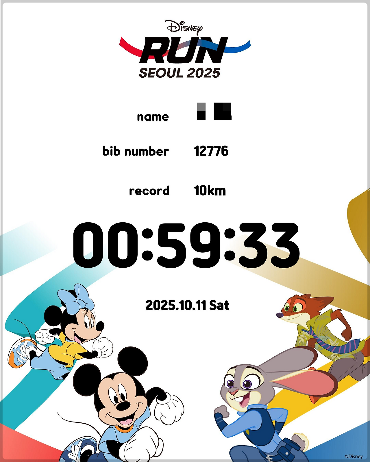 10월 11일 디즈니런에서 기록한 10K 59:33은 단순 완주가 아니라